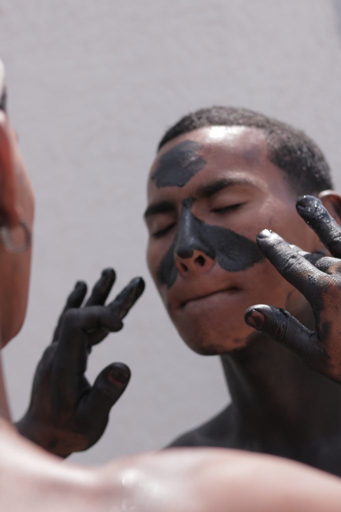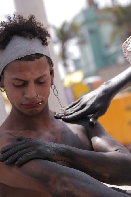 Si algo se hace en la vía 40 es caminar, de arriba abajo, recorriendo la misma calle más de cinco veces. Nosotras buscando historias, algunos vendiendo comida, gafas, gorros e incluso hielo y otros ultimando detalles de las carrozas, los vestidos, y los maquillajes. Pero dos personas en particular, al costado de la calle, en un rincón con sombra, de los pocos que hay en la vía, se pintan el uno al otro. Se van transformando con aquel disfraz que no necesita de tela ni arandelas; solo piel, carbón y aceite.