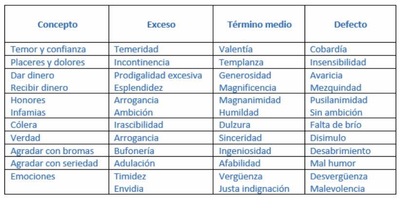 Esto que es bueno para el ser humano concreto, lo es para la generalidad como guía, y la lista de Aristóteles es larga: entre ellas aparecen la valentía, la paciencia, la magnanimidad, el ingenio, la simpatía, el pudor y la generosidad, todas ellas ubicadas en un justo medio entre dos extremos vicioso. La cobardía como carencia o defecto, y la temeridad como exceso, por ejemplo, son los dos extremos, y el medio está la virtud de la valentía.