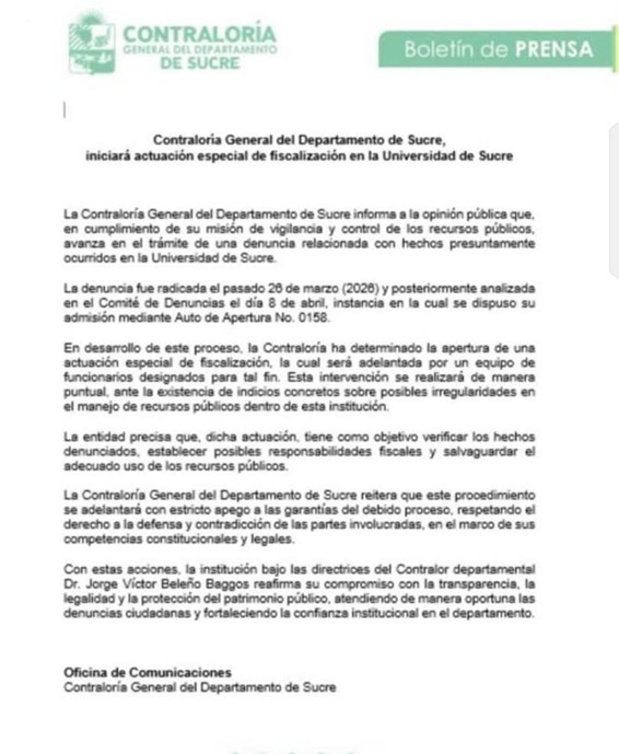 Ante estos hallazgos, los estudiantes interpusieron una denuncia ante la Contraloría General del Departamento de Sucre el 26 de marzo de 2026. El caso fue evaluado por el Comité de Denuncias el 8 de abril de 2026, tras lo cual se ordenó la apertura de una actuación especial de fiscalización. Un equipo de funcionarios será el encargado de verificar los hechos, determinar posibles responsabilidades fiscales y garantizar el uso adecuado de los recursos públicos.