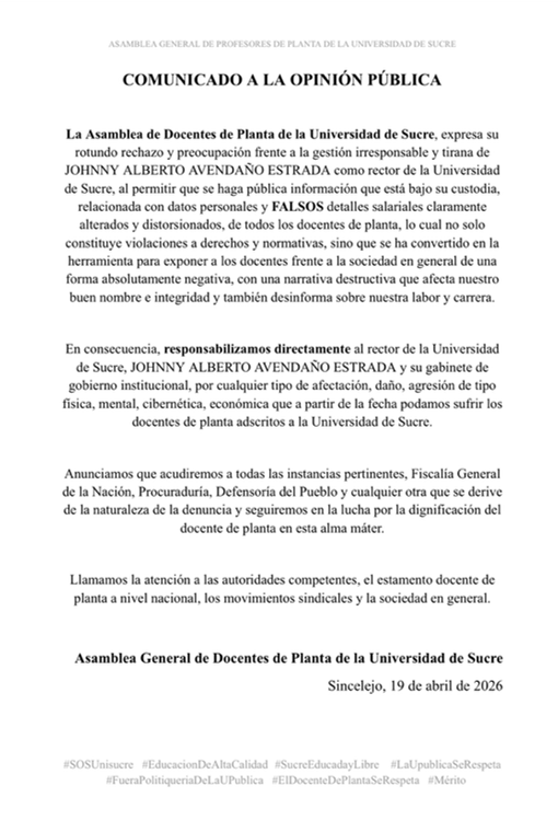 La gobernadora a través de un comunicado a la opinión pública sostuvo que “la Universidad de Sucre es el alma máter de miles de sucreños, símbolo de orgullo regional, motor de transformación social y una de las mayores esperanzas de progreso para nuestras nuevas generaciones. Por eso, cualquier situación que afecte su estabilidad, su confianza institucional y la tranquilidad de su comunidad universitaria nos convoca a todos”, al tiempo que invita a los organismos de control para que, dentro de sus competencias y con total apego al debido proceso, avancen en las actuaciones necesarias que permitan esclarecer los hechos, garantizar la transparencia y brindar tranquilidad a la comunidad educativa y a toda la sociedad sucreña.