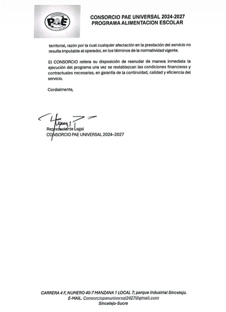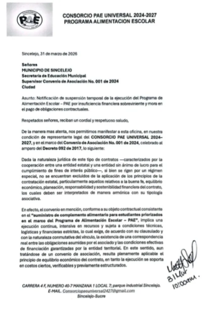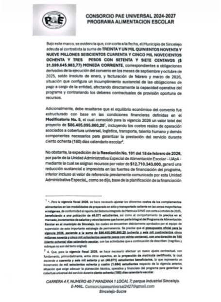 A través de un comunicado oficial firmado el 31 de marzo de 2026, el consorcio notificó a la Secretaría de Educación Municipal la imposibilidad de continuar con el programa, debido a la mora en el pago de las obligaciones contractuales. El municipio de Sincelejo está debiendo más de 31.599 millones de pesos, correspondientes a saldos insolutos de enero y facturaciones de los meses de febrero y marzo.