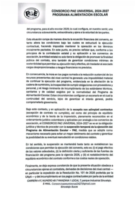 El consorcio sostiene que la situación ha roto la “ecuación financiera” del convenio, exacerbada por la Resolución No. 101 de la Unidad Administrativa Especial de Alimentación Escolar (UApA), que redujo sustancialmente los recursos previstos.