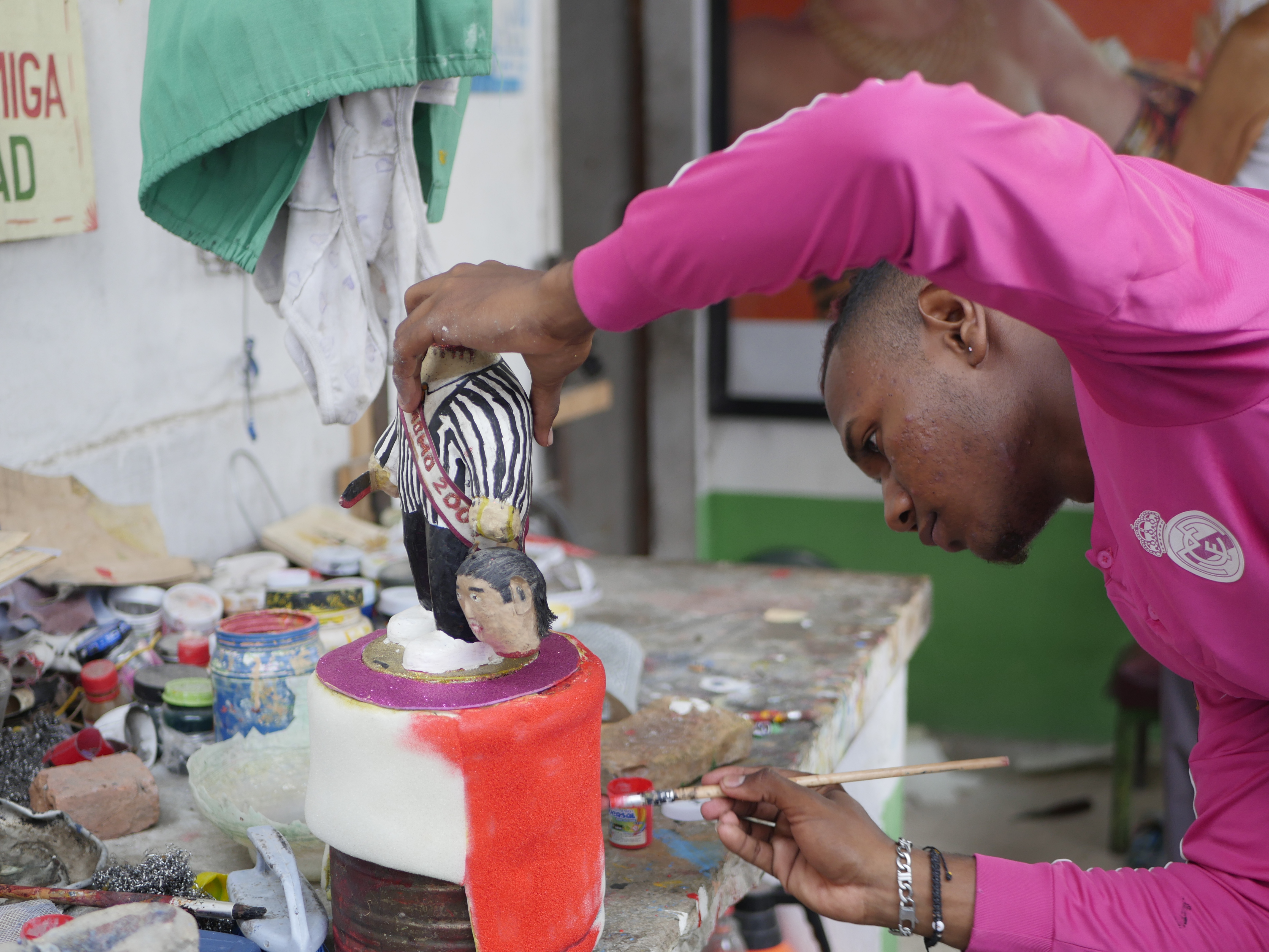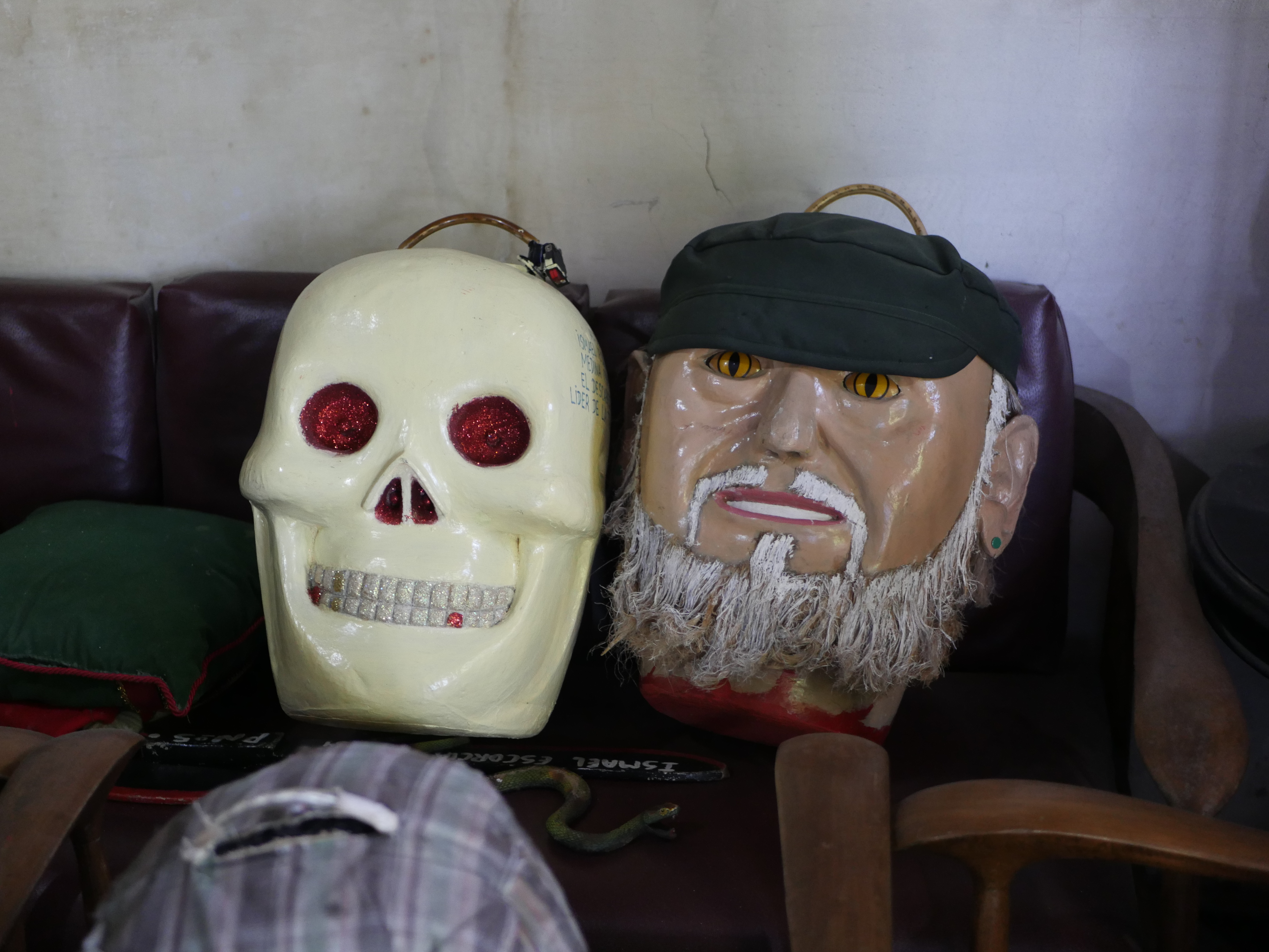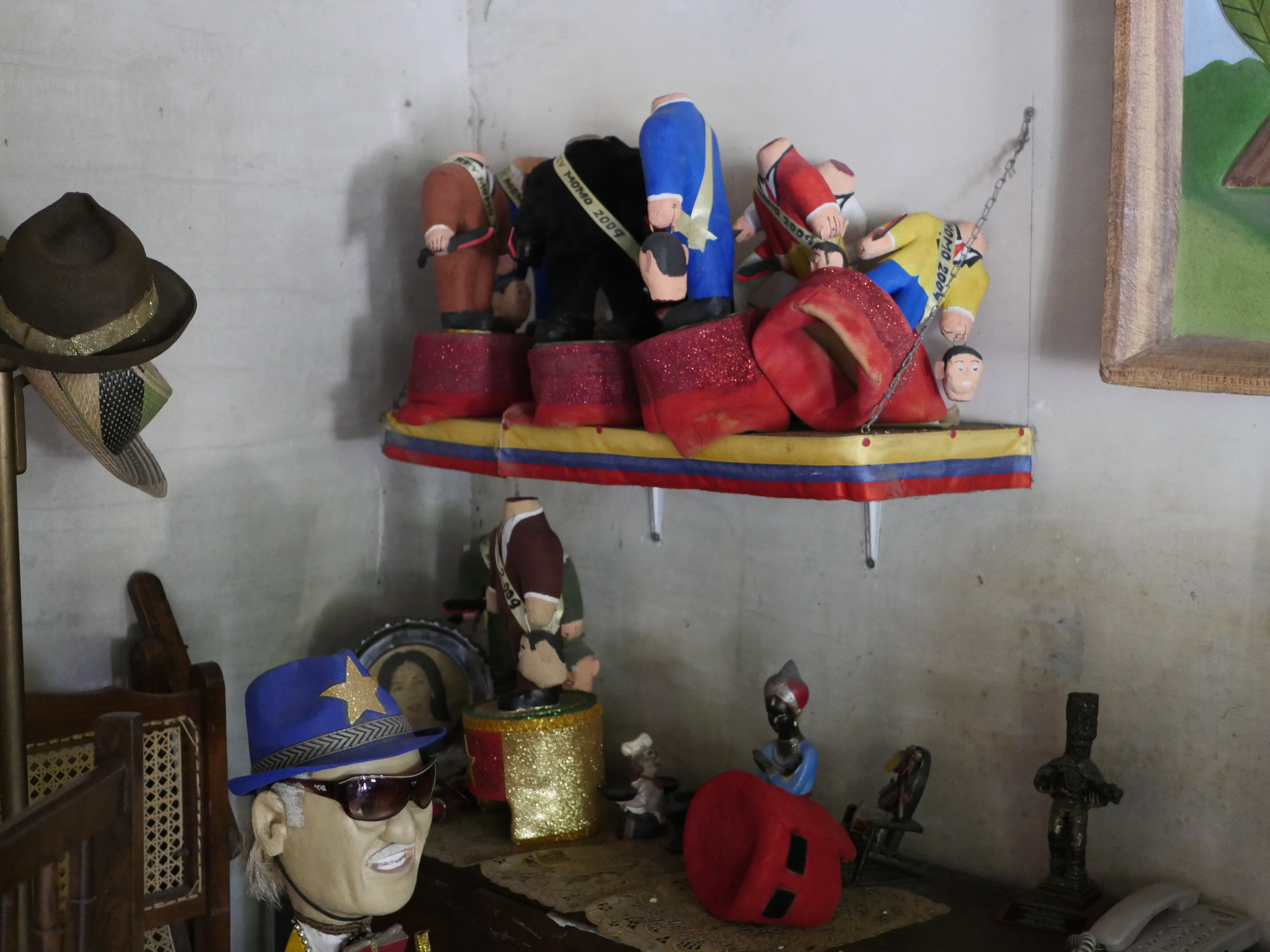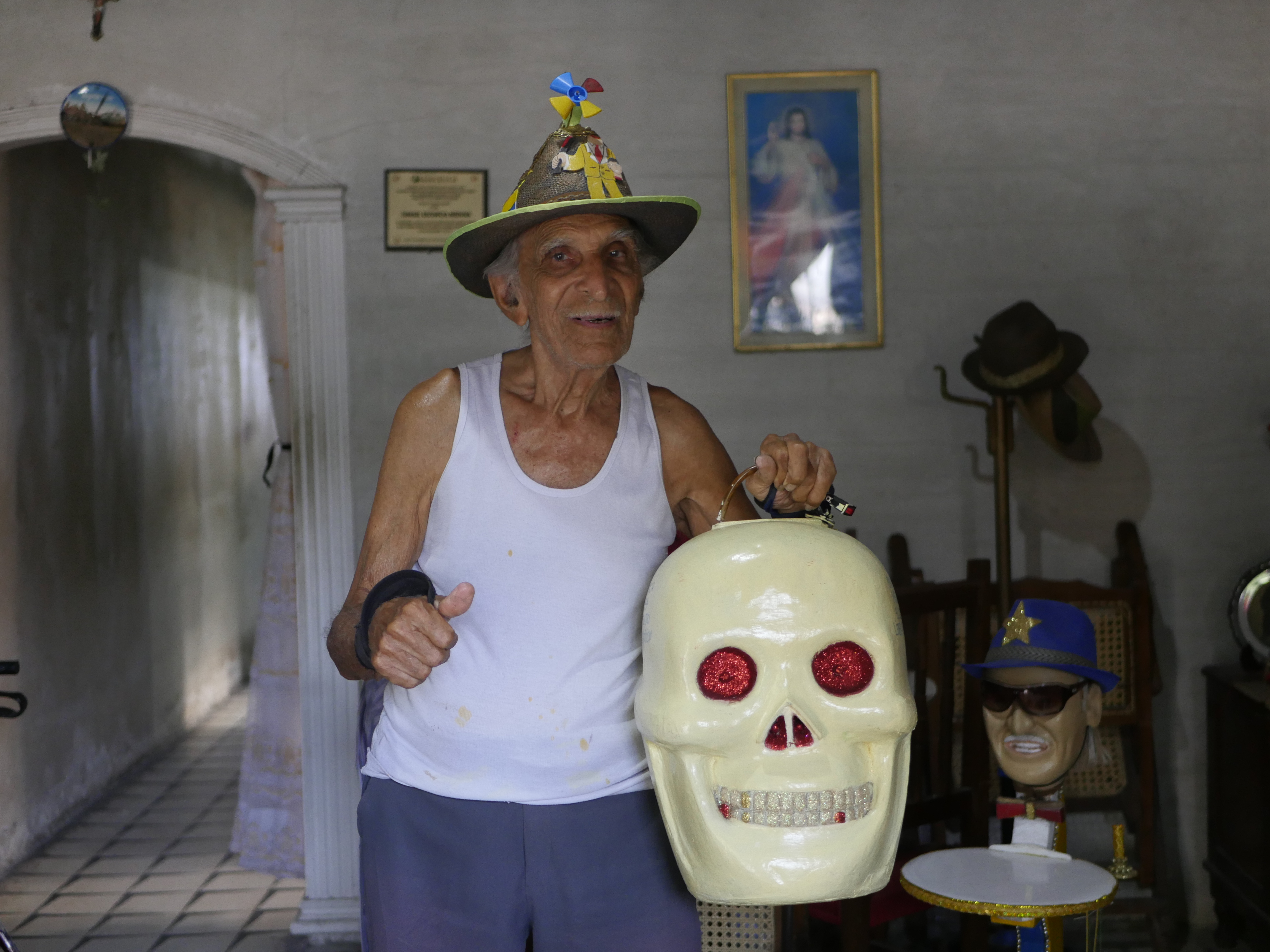 El atardecer se apoderaba de la plaza, algunos pájaros regresaban a los árboles. Después de casi 1 hora y media partimos junto a Wilfrido rumbo al barrio El Santuario a la casa de Ismael Escorcia. Mientras íbamos en el taxi Wilfrido nos relataba como fue el cumpleaños número 90 de su padre que había tenido lugar 3 días antes de nuestro encuentro. Después de media hora de camino pasamos por la puerta del museo del descabezado al sur de la ciudad, donde se encuentran un sinnúmero de cabezas diseñadas por este hacedor del carnaval. A dos cuadras del museo llegamos al hogar del creador del descabezado. Al entrar a su casa, encontramos en la sala un viejo sofá donde reposaban las cabezas de una muerte y del fallecido Fidel Castro. Al fondo, un estante lleno de “muñequitos descabezados” y debajo de este un busto que representa la cabeza de Ismael, con gafas de sol y un sombrero azul, quien es su fiel compañero.