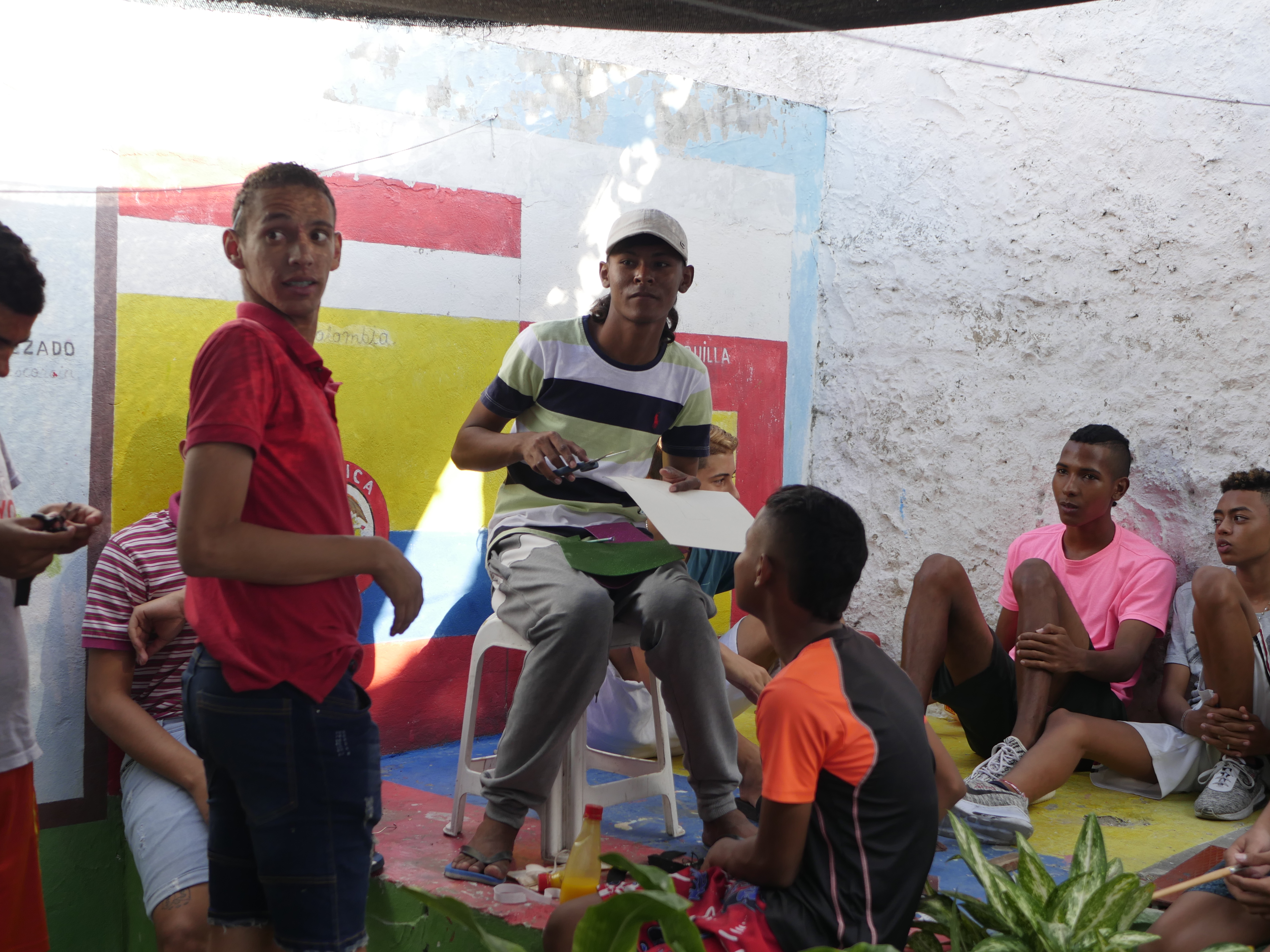 Al pasar por un pasillo alcanzamos a ver al fondo un grupo de jóvenes dándole un último toque de pintura a las cabezas que desfilaran el siguiente día por la vía 40 en el desfile de la Batalla de flores 2020. Escorcía estaba sentado en un viejo mecedor con una camisilla de franela blanca, pantalón gris y chancletas. En su rostro se nota la edad en la que las cosas se miran con más calma. Ya no es un joven, su cabello es blanco como la nieve, las arrugas se posan sobre sus mejillas, pero en sus ojos claros se ve la mirada de un niño, ansioso por vivir de nuevo otro carnaval. Al vernos se levanta de su asiento para saludarnos. Aunque su andar sea lento, su emoción al ver que lo visitamos alegra el ambiente. Después de saludarnos, le da algunas indicaciones a los jóvenes, esto se lo permite sus más de 50 años de experiencia que tiene elaborando este traje. Al mismo tiempo nos cuenta que aunque ha participado en muchos desfiles del carnaval, sigue sintiendo la misma ansiedad a pesar de que ya no participe directamente en ellos y espera como en otros años, alcanzar un congo de oro.