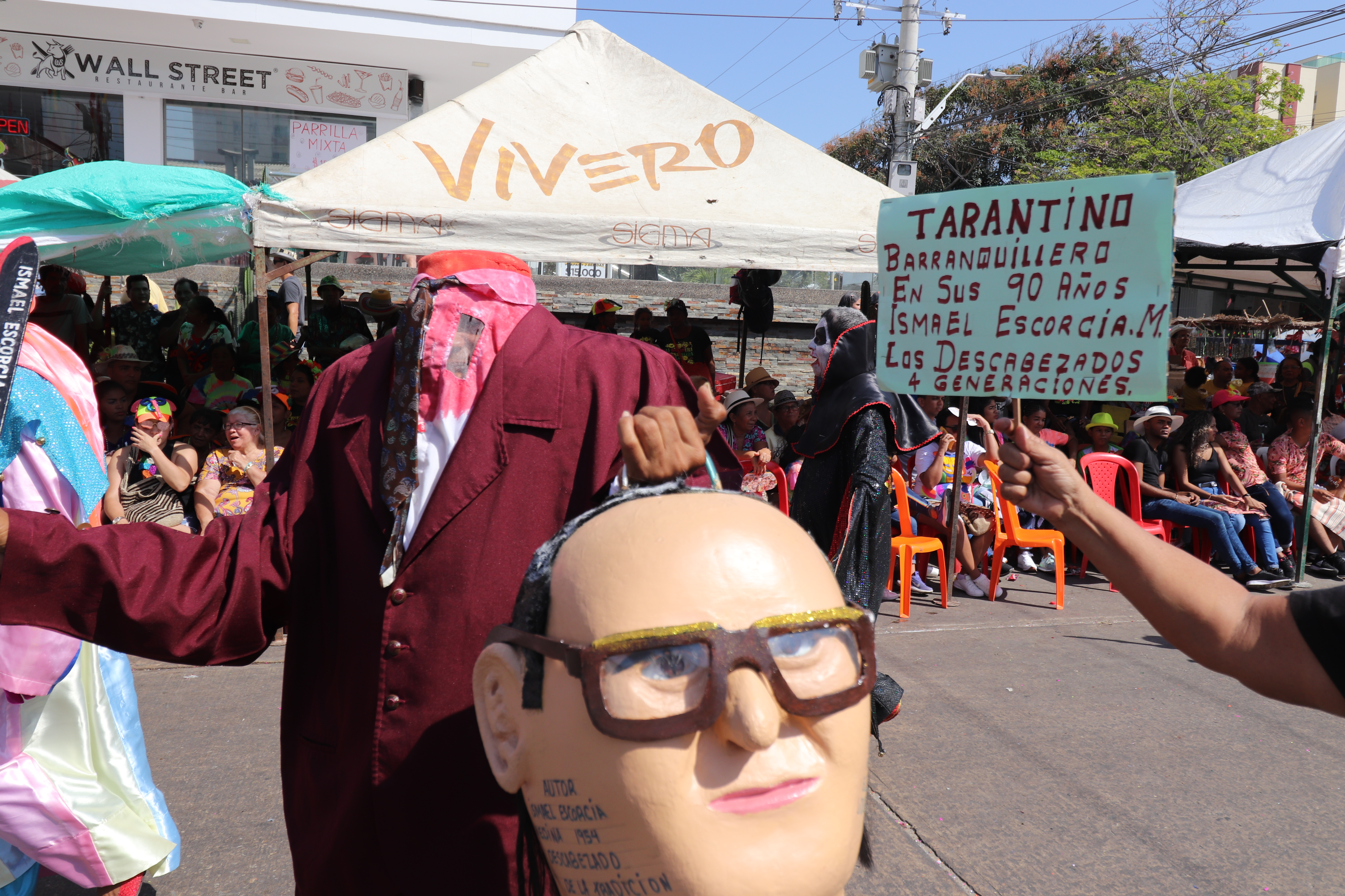 Eran las 2:30 de la tarde, Plaza de la Paz, el calor sofocaba el ambiente, el sol de Barranquilla estaba en lo alto y hacían unos 34°. Soplaba algo de brisa, de fondo se encontraban adecuando la tarima para la noche de Tambó. Mientras esperábamos, decidimos tomar un poco de sombra bajo uno de los palos de almendra de la remodelada plaza. Estábamos impacientes y ansiosos por conocer a Wilfrido Escorcia, quien actualmente lidera el disfraz de los hombres gigantes, sin cabezas, con trajes de color oscuro y ensangrentados que con un machete y su cabeza en las manos recorren todos los años el Cumbiódromo de la Vía 40.