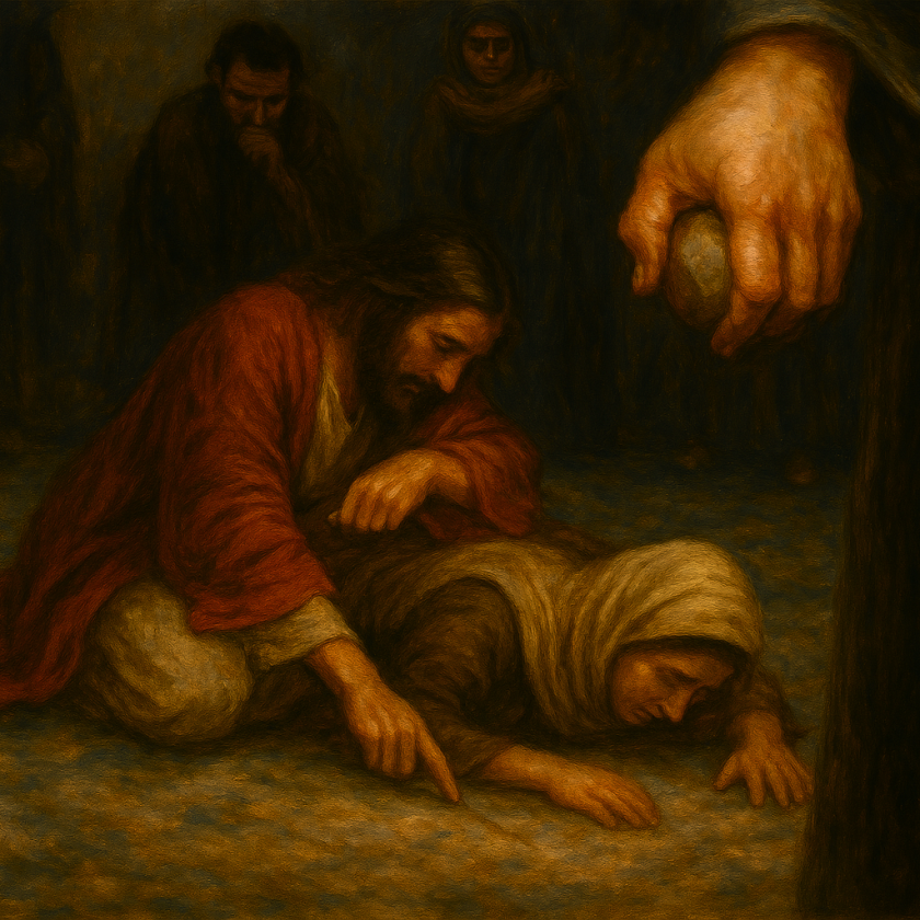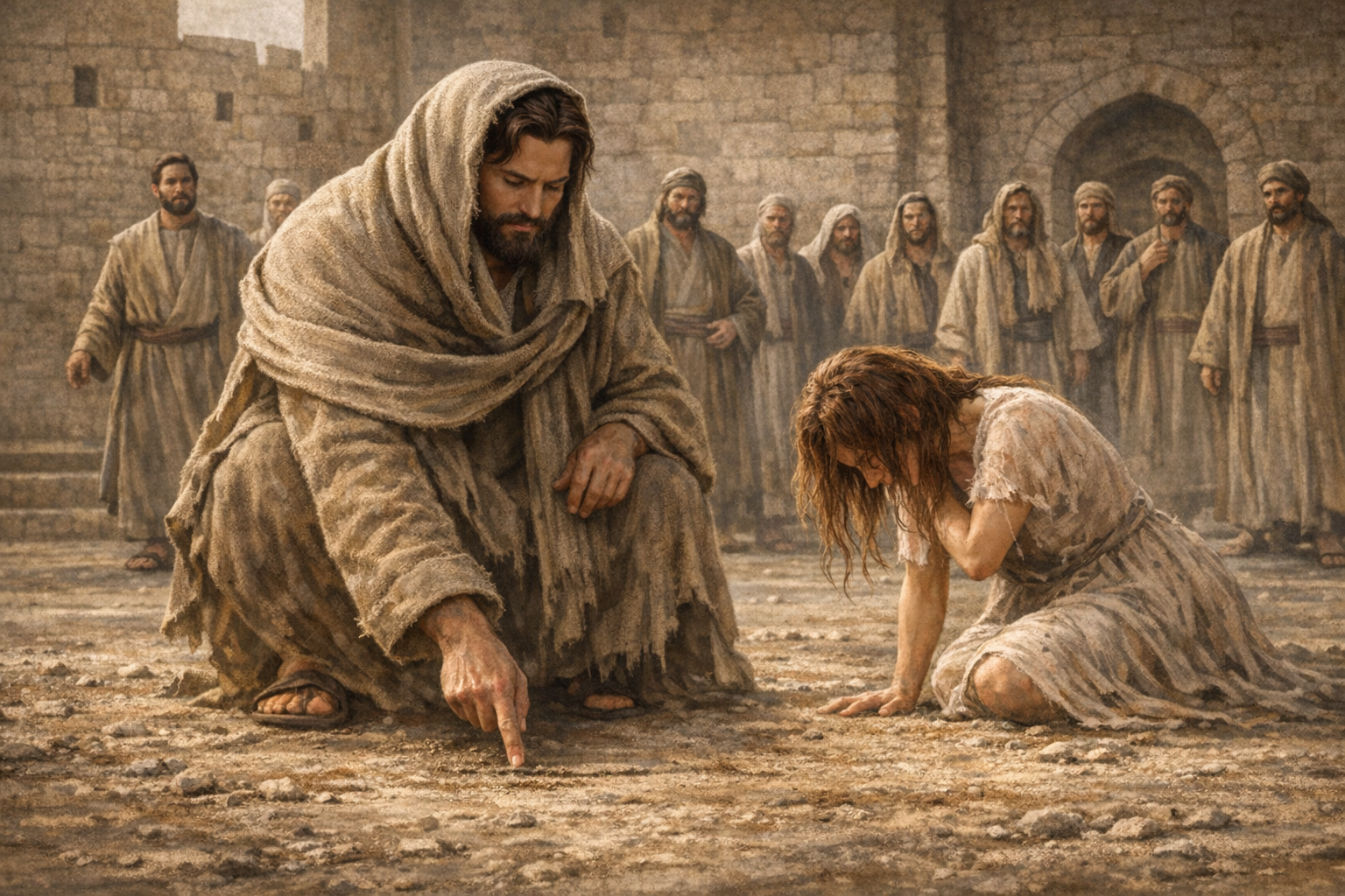 Y Jesús se fue al monte de los Olivos. Y por la mañana volvió al templo, y todo el pueblo vino a él; y sentado él, les enseñaba. Entonces, los escribas y los fariseos le trajeron una mujer sorprendida en adulterio; y poniéndola en medio, le dijeron: “Maestro, esta mujer ha sido sorprendida en el acto mismo de adulterio, y en la ley nos mandó Moisés apedrear a tales mujeres. Tú, pues, ¿qué dices?”. Mas esto decían tentándole, para poder acusarle. Pero Jesús, inclinado hacia el suelo, escribía en tierra con el dedo.